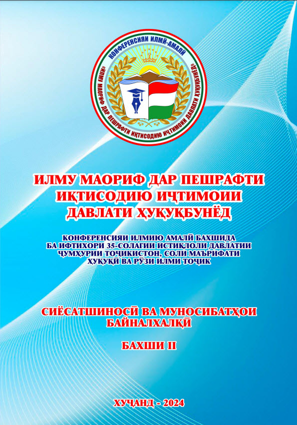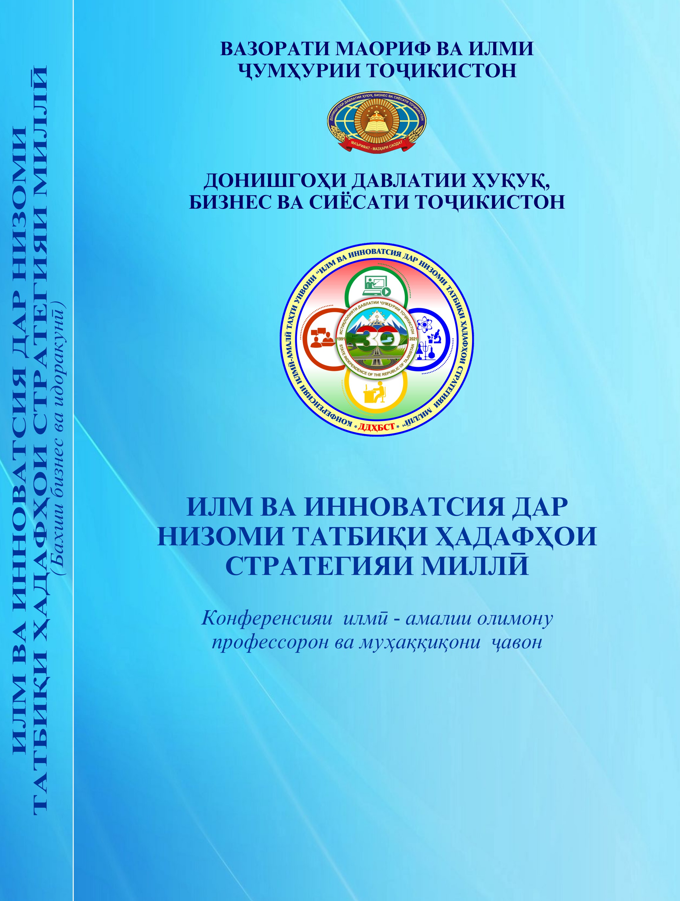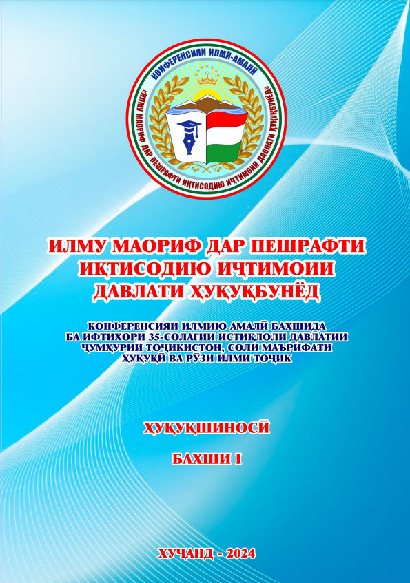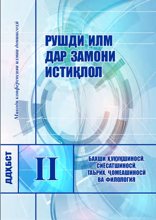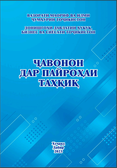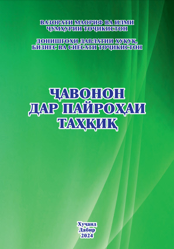 Адабиёти тозанашр 2017201820192020202120222023202420252017 Ҷавонон ва масъалаҳои муосири ҷомеа Ҷавонон пайрави Пешвои миллат Рушди илм дар замони Истиқлол Рушди илм дар замони Истиқлол – 2 2018 Масоили мубрами илми ҳуқуқшиносии муосир ва роҳҳои ҳалли онҳо: назария ва амалия-1 Масоили мубрами илми ҳуқуқшиносии муосир ва роҳҳои ҳалли онҳо: назария ва амалия – 2 Ҳамкориҳои байналмилалии муассисаҳои таълимӣ омили муҳими баланд бардоштани сифати таълим 2019 Илм ва инноватсия баҳри иҷрои ҳадафҳои миллӣ Ҳуқуқшиносӣ Илм ва инноватсия баҳри иҷрои ҳадафҳои миллӣ Сиёсатшиносӣ Илм ва инноватсия баҳри иҷрои ҳадафҳои миллӣ Молия Илм ва инноватсия баҳри иҷрои ҳадафҳои миллӣ Бизнес ва идоракунӣ Илм ва инноватсия баҳри иҷрои ҳадафҳои миллӣ Инноватсия ва телекоммуникатсия Илм ва инноватсия баҳри иҷрои ҳадафҳои миллӣ Баҳисобгирӣ ва андоз Ҷавонон дар пайроҳаи таҳқиқ Нақши технологияҳои информатсионӣ дар баланд бароштани сифати таълим Робитаҳои кишварҳои осиёи марказӣ: Ҳолат ва дурнамо Робитаҳои кишварҳои осиёи марказӣ: Ҳолат ва дурнамо 2020 Такмили қонунгузории зиддикоррупсионӣ: муаммоҳо ва дурнамои рушд Ҷавонон дар пайроҳаи таҳқиқ Рушди фанҳои табиатшиносӣ, дақиқ ва риёзӣ дар низоми ташаккулёбии иқтисодиёти рақамӣ Ҳуқуқшиносӣ Рушди фанҳои табиатшиносӣ, дақиқ ва риёзӣ дар низоми ташаккулёбии иқтисодиёти рақамӣ Бизнес ва Баҳисобгирӣ Рушди фанҳои табиатшиносӣ, дақиқ ва риёзӣ дар низоми ташаккулёбии иқтисодиёти рақамӣ Сиёсатшиносӣ Рушди фанҳои табиатшиносӣ, дақиқ ва риёзӣ дар низоми ташаккулёбии иқтисодиёти рақамӣ Молия Рушди фанҳои табиатшиносӣ, дақиқ ва риёзӣ дар низоми ташаккулёбии иқтисодиёти рақамӣ Инноватсия ва телеммуникатсия Андалеби боғистони адаб Таъмини рушди устувор ва рақобатпазирии иқтисодиёти Тоҷикистон дар шароити ҷаҳонишавӣ 2021 Саноатикунонии босуръат – асоси ташаккули иқтисодиёти инноватсиноӣ Ҳамкориҳои байналмилалии Ҷумҳурии Тоҷикистон дар шароити рақамикунонии иқтисодиёт: ҳолат ва дурнамо Консепсияи миллии тарбия-асоси тарбияи насли созандаю бунёдкор Усулҳои инноватсионии таълим: ҳолати муосир ва дурнамои такомул Иқтисодиёти Тоҷикистон дар солҳои истиқлолият: таърих, хусусият ва дурнамои рушд Ҷавонон дар пайроҳаи таҳқиқ Илм ва инноватсия дар низоми татбиқи ҳадафҳои Стратегияи миллӣ -Баҳисобгирӣ ва андоз Илм ва инноватсия дар низоми татбиқи ҳадафҳои Стратегияи миллӣ -Инноватсия ва телекоммуникатсия Илм ва инноватсия дар низоми татбиқи ҳадафҳои Стратегияи миллӣ -Бизнес ва идоракунӣ Илм ва инноватсия дар низоми татбиқи ҳадафҳои Стратегияи миллӣ -Молия Илм ва инноватсия дар низоми татбиқи ҳадафҳои Стратегияи миллӣ -Сиёсатшиносӣ Илм ва инноватсия дар низоми татбиқи ҳадафҳои Стратегияи миллӣ -Ҳуқуқшиносӣ СҲШ ДАР ИҚТИСОДИЁТИ ҶАҲОНӢ: 20 соли фаъолияти самарабахш ва дурнамо Робитаҳои байналмилалии Донишгоҳи Давлатии Ҳуқуқ, Бизнес ва Сиёсати Тоҷикистон 2022 Таъмини рушди устувор ва рақобатпазирии иқтисодиёти миллӣ дар шароити ҷаҳонишавӣ Иҷлосияи XVI Шӯрои Олӣ ҷумҳурии Тоҷикистон ва нақши пешвои миллат мӯҳтарам Эмомалӣ Раҳмон дар бунёди давлатдории миллӣ Иҷлосияи XVI Шӯрои Олӣ дар рушди Тоҷикистони соҳибистиқлол Истифодаи усулҳои инноватсионӣ дар татбиқи тадқиқоти байнифаннӣ дар муассисаҳои таҳсилоти олии касбӣ Ҷавонон дар пайроҳаи таҳқиқ Муаммоҳои мубрами методикаи таълими фанҳои риёзӣ, дақиқ ва табиӣ дар муасси