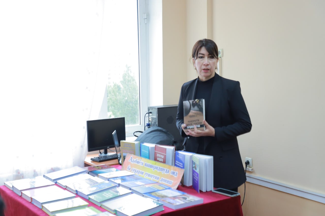 Сипас китобдор Умарова У. маводи таълимии тозанашрро муаррифӣ намуд. Дар намоиш, инчунин китобҳои дарсӣ, комплексҳои таълимӣ–методӣ, дастурҳо вобаста ба тахассусашон, ки аз ҷониби устодону омӯзгорони донишгоҳ рӯйи чоп омадаанд, муаррифӣ карда шуд. Дар рафти чорабинӣ донишҷӯён бо адабиёти ба тахассусашон вобаста шинос шуда, инчунин ба донишҷӯёни таҳсилоти фосилавӣ оид ба қоидаҳои истифодабарии китобхона ва аъзо шудан ба китобхона аз ҷониби кормандони китобхонаи илмӣ маълумот дода шуд.