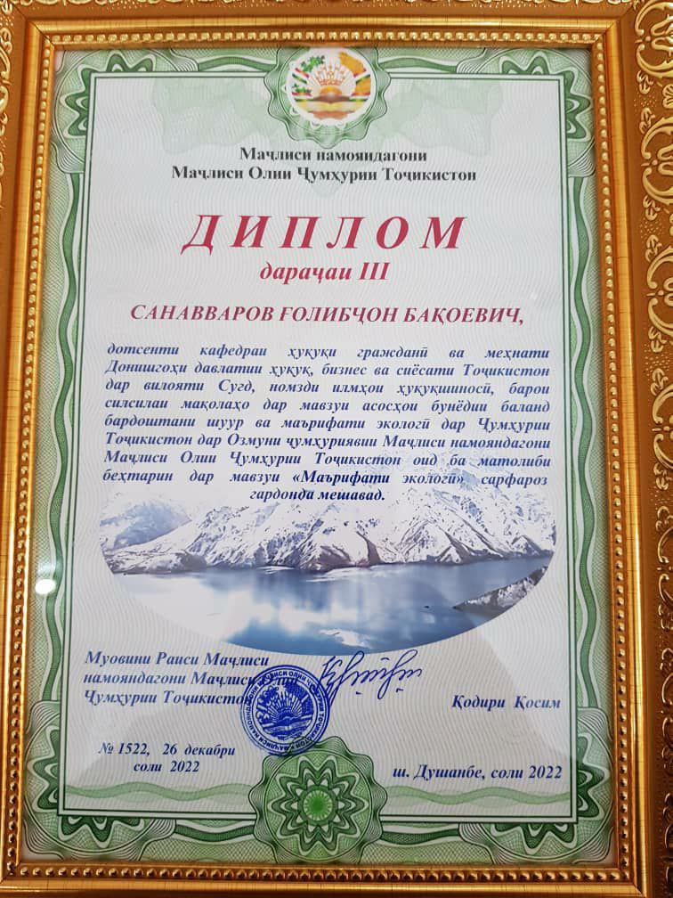 Дотсенти кафедраи ҳуқуқи гражданӣ ва меҳнати Донишгоҳи давлатии ҳуқуқ, бизнес ва сиёсати Тоҷикистон Ғолибҷон Санавваров дар озмуни ҷумҳуриявии матолиби беҳтарин дар мавзӯи «Маърифати экологӣ» иштирок намуда, барои силсилаи мақолаҳо дар мавзӯи асосҳои бунёдии баланд бардоштани шуур ва маърифати экологӣ дар Ҷумҳурии Тоҷикистон ба гирифтани мақоми ифтихорӣ шарафёб шуд.