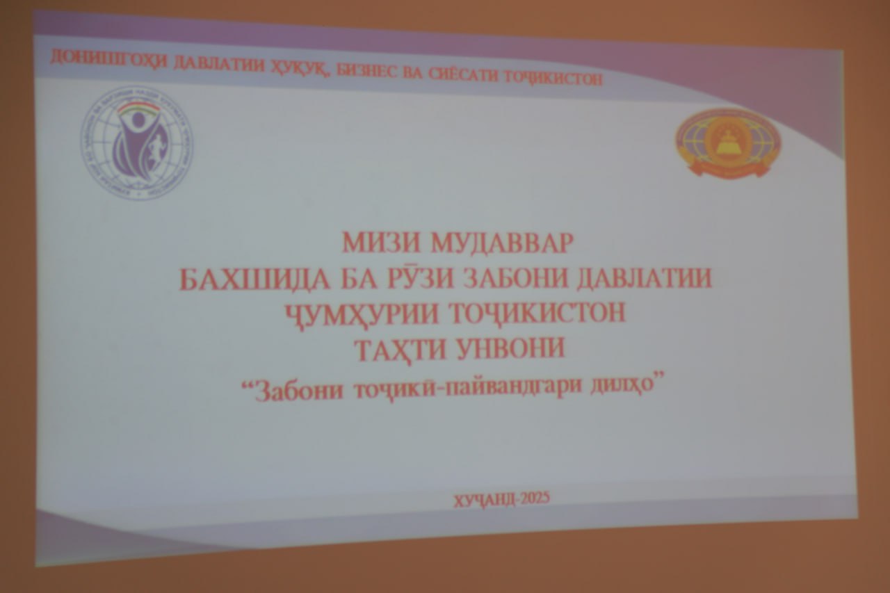 01 октябри соли 2025 дар Донишгоҳи давлатии ҳуқуқ, бизнес ва сиёсати Тоҷикистон ба ифтихори Рӯзи забони давлатии Ҷумҳурии Тоҷикистон бо иштироки фаъолонаи аъзои маҳфили “Пайравони Пешвои миллат” мизи мудаввар таҳти унвони “Забони тоҷикӣ – пайвандгари дилҳо” баргузор гардид.
