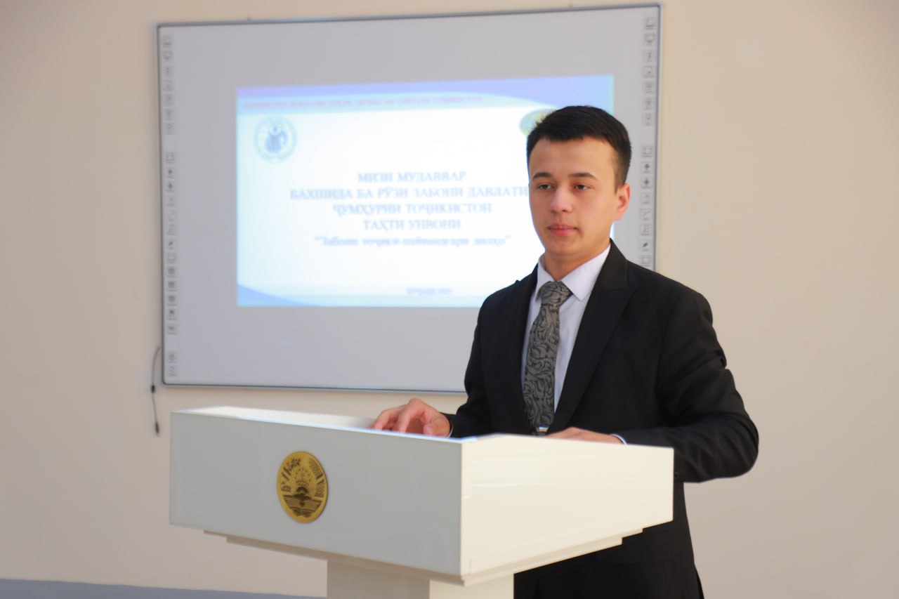 Дар чорабинии мазкур муовини ректор оид ба корҳои тарбия, дотсент Норматова Шаҳноза иштирок ва суханронӣ намуда, аз ҷумла таъкид дошт, ки забони давлатӣ яке аз рукнҳои муҳимтарини давлатдории миллӣ буда, эҳтиром ва арҷгузорӣ ба он вазифаи шаҳрвандии ҳар як фарди ҷомеа мебошад.