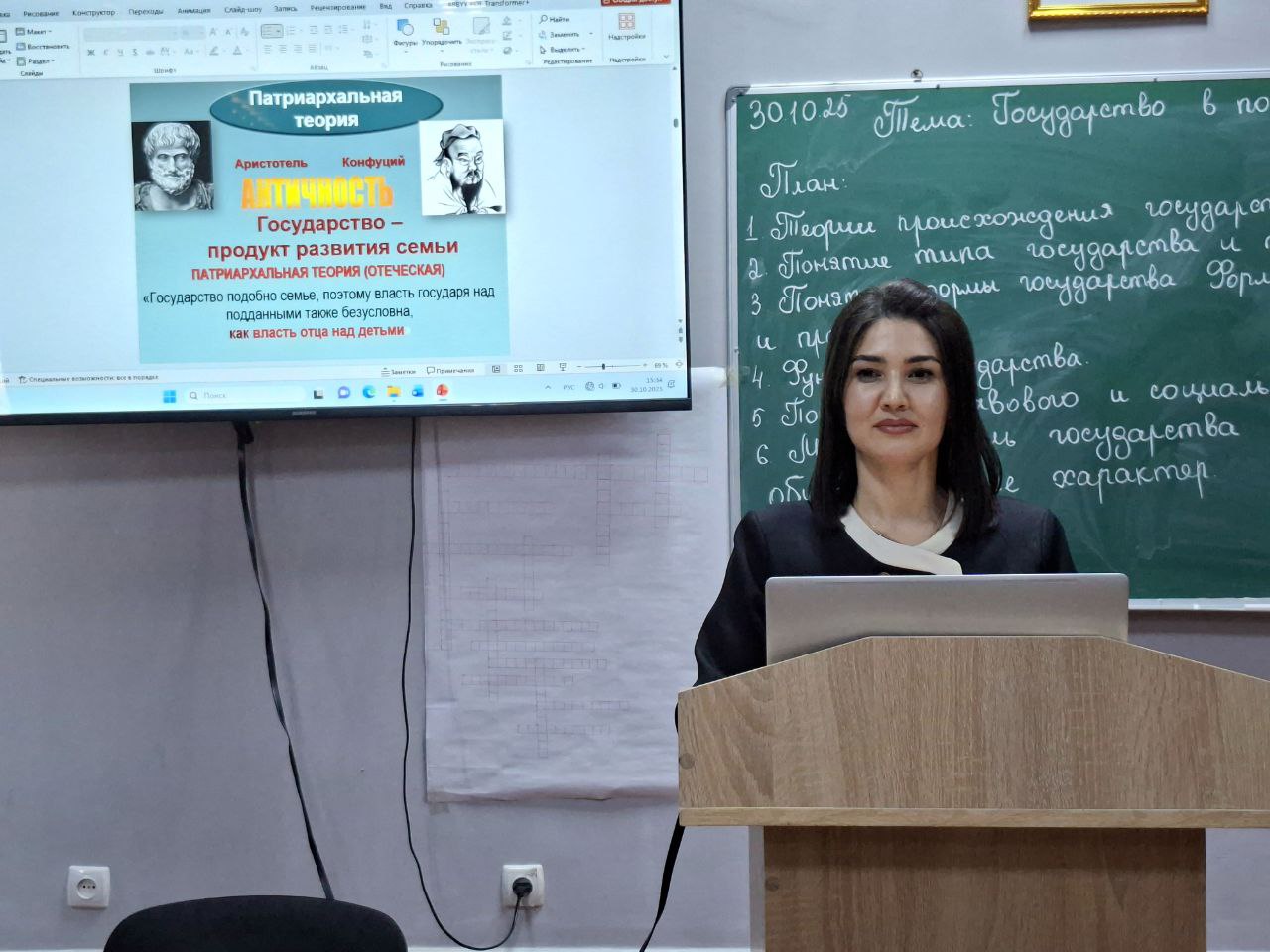 30 октябри соли 2025, дар бинои таълимии №2-и Донишгоҳи давлатии ҳуқуқ, бизнес ва сиёсати Тоҷикистон дарси намунавии лексионии номзади илмҳои таърих, дотсенти кафедраи сиёсатшиносӣ Солихоҷаева С.А. аз фанни сиёсатшиносӣ дар мавзуи «Давлат дар системаи сиёсӣ» баргузор гардид.