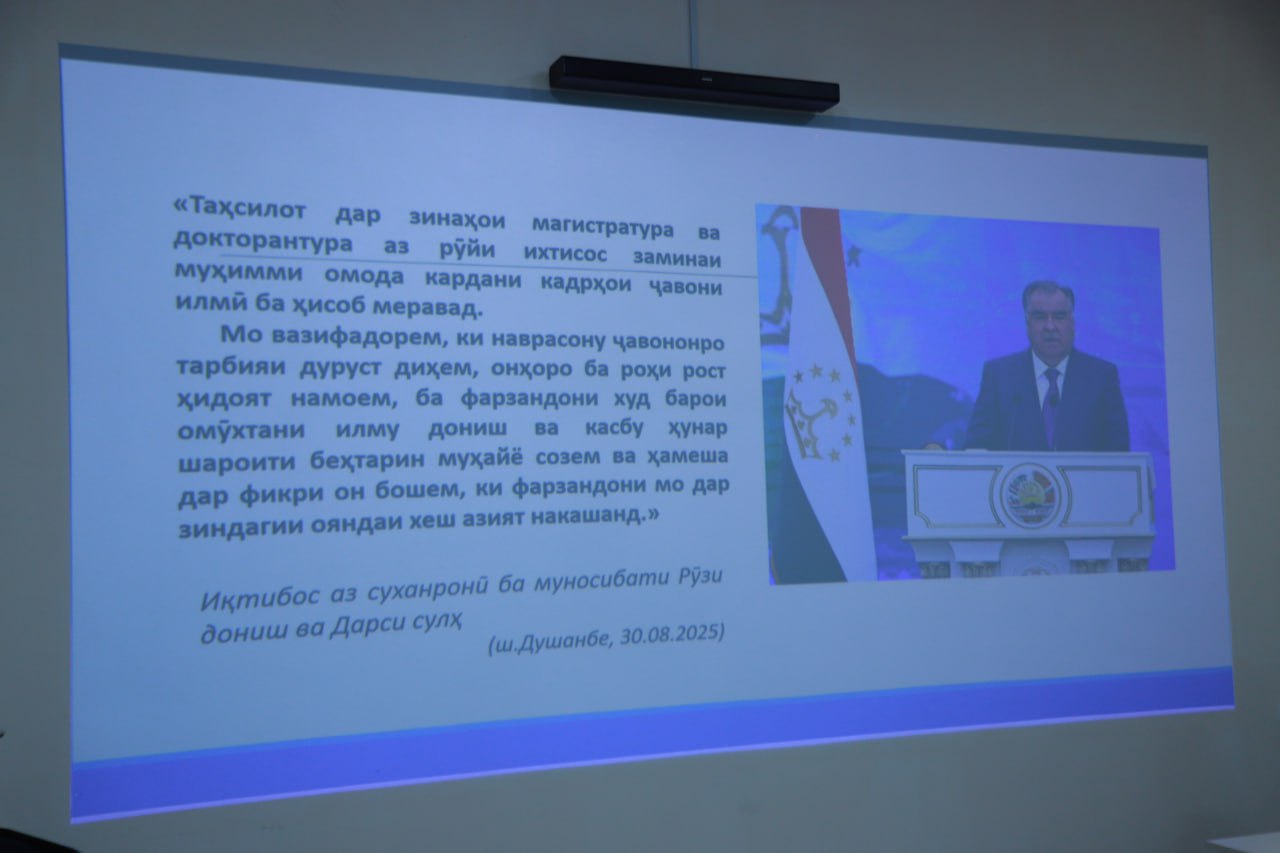 Расширение круга научных исследований, подготовка научных статей, соблюдение норм литературного языка, орфографических правил таджикского языка, а также особенностей использования знаков препинания в научных трудах относятся к числу актуальных вопросов исследовательской деятельности магистрантов, докторантов и соискателей ученых степеней университета.