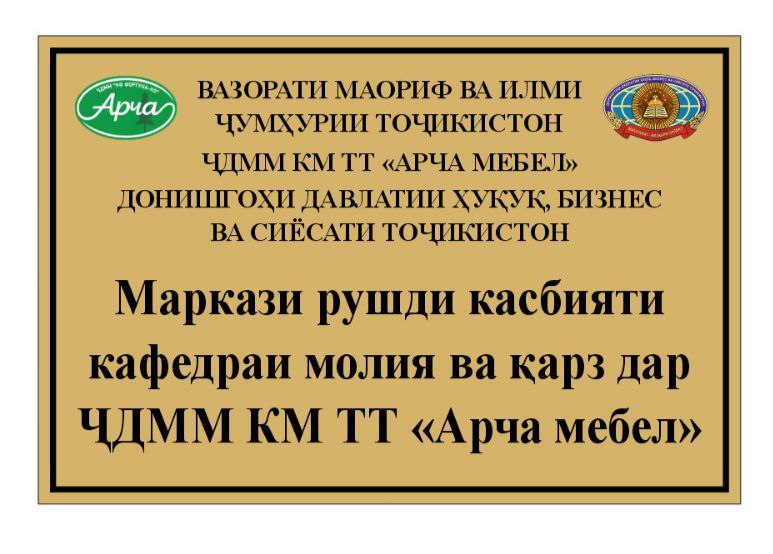 Маврид ба зикр аст, ки ин иқдом дар асоси дастуру супоришҳои Асосгузори сулҳу ваҳдати миллӣ – Пешвои миллат, Президенти Ҷумҳурии Тоҷикистон муҳтарам Эмомалӣ Раҳмон, ки дар Паёми навбатӣ ба Маҷлиси Олии Ҷумҳурии Тоҷикистон ироа гардида буданд, амалӣ карда шуд. Дар ҳамин замина, 19 январи соли 2026 бо ташаббуси мудири кафедраи молия ва қарз, н. и. и., дотсент Каримова М.И. ва мудири кафедраи иқтисодиёти корхонаҳо ва минтақа, н. и., дотсент Қаюмов Ф. Ғ., инчунин бо иштироки мудири шуъбаи таҷрибаомӯзӣ ва кор бо мутахассисони ҷавон Сатторова М.А. маросими ифтитоҳи Маркази рушди касбияти кафедраи молия ва қарзи Донишгоҳи давлатии ҳуқуқ, бизнес ва сиёсати Тоҷикистон дар назди Раёсати Вазорати молияи Ҷумҳурии Тоҷикистон дар шаҳри Хуҷанд ва ҶДММ “Арча мебел” баргузор гардид.