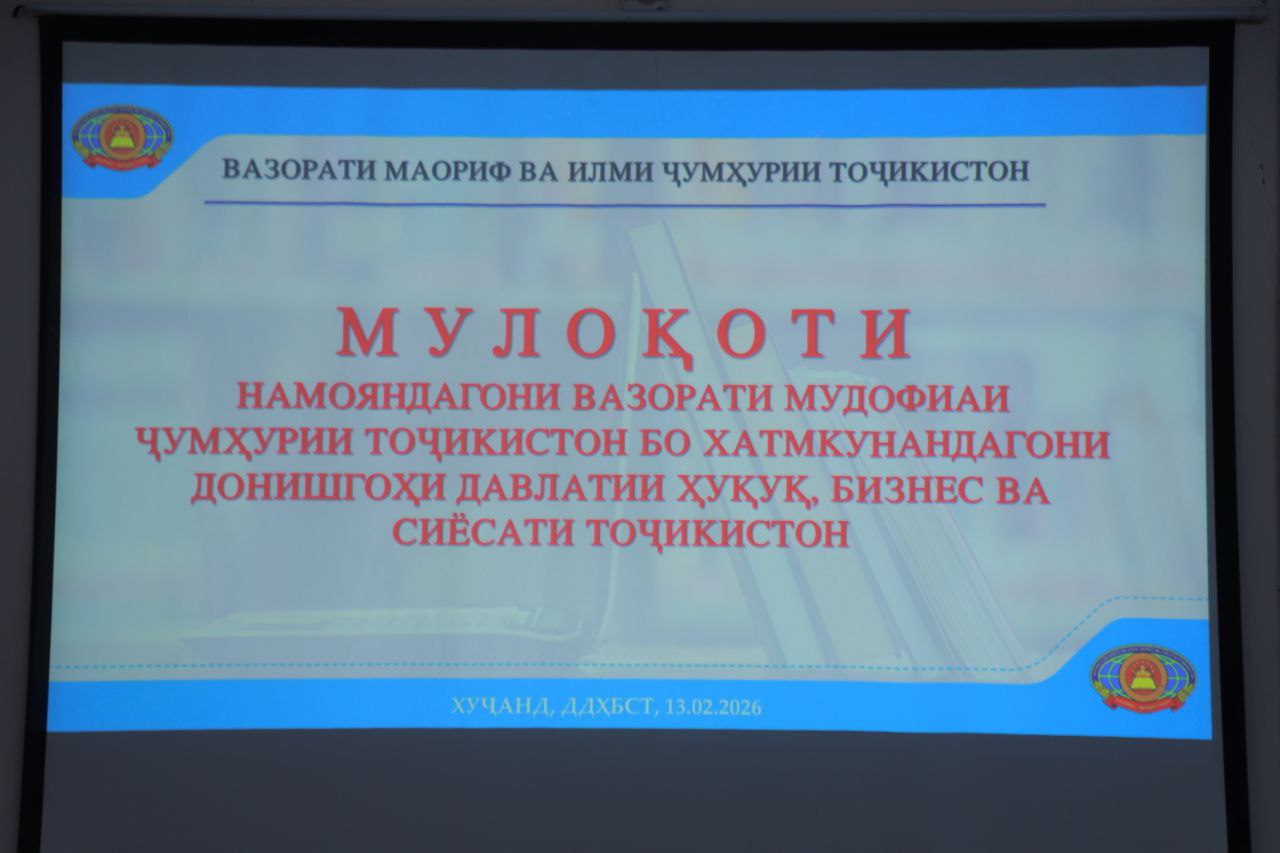 13 феврали соли 2026 дар маҷлисгоҳи Донишгоҳи давлатии ҳуқуқ, бизнес ва сиёсати Тоҷикистон мулоқоти судманду созандаи намояндагони Вазорати мудофиаи Ҷумҳурии Тоҷикистон бо хатмкунандагони Донишгоҳ баргузор гардид. Ҳадафи асосии вохӯрӣ таҳкими ҳисси ватандӯстӣ, баланд бардоштани маърифати ҳуқуқӣ ва ҷалби ҷавонони соҳибмаълумот ба адои хизмат дар сафи Артиши миллӣ буд.