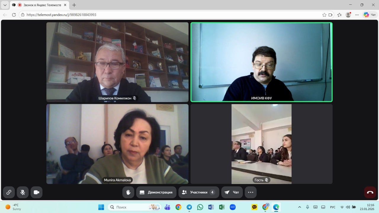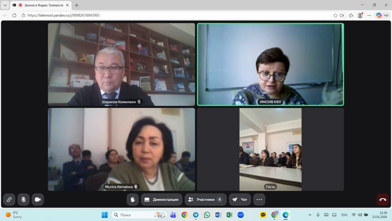 On January 23, 2026, at the Tajik State University of Law, Business and Politics, in line with the instructions and guidance of the Founder of Peace and National Unity — Leader of the Nation, President of the Republic of Tajikistan, His Excellency Emomali Rahmon, aimed at strengthening strategic partnership, expanding international cooperation, and developing scientific diplomacy, a virtual scientific and educational event was held with the participation of Kazan Federal University of the Republic of Tatarstan of the Russian Federation.