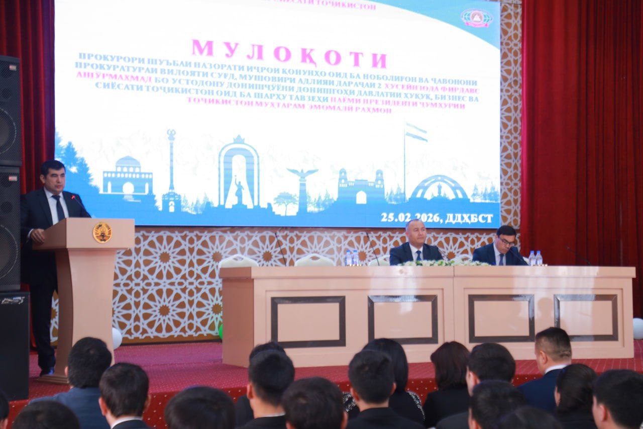 25 феврали соли 2026 дар Донишгоҳи давлатии ҳуқуқ, бизнес ва сиёсати Тоҷикистон мулоқоти муҳим оид ба шарҳу тавзеҳи Паёми Президенти Ҷумҳурии Тоҷикистон, Пешвои миллат муҳтарам Эмомалӣ Раҳмон ба Маҷлиси Олӣ баргузор гардид. Ҳадафи чорабинӣ баррасии самтҳои афзалиятноки сиёсати давлатӣ, тавзеҳи нуктаҳои асосии Паём ва ҷалби омӯзгорону донишҷӯён ба татбиқи амалии он дар заминаи илмӣ ва маърифатӣ буд.
