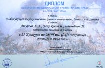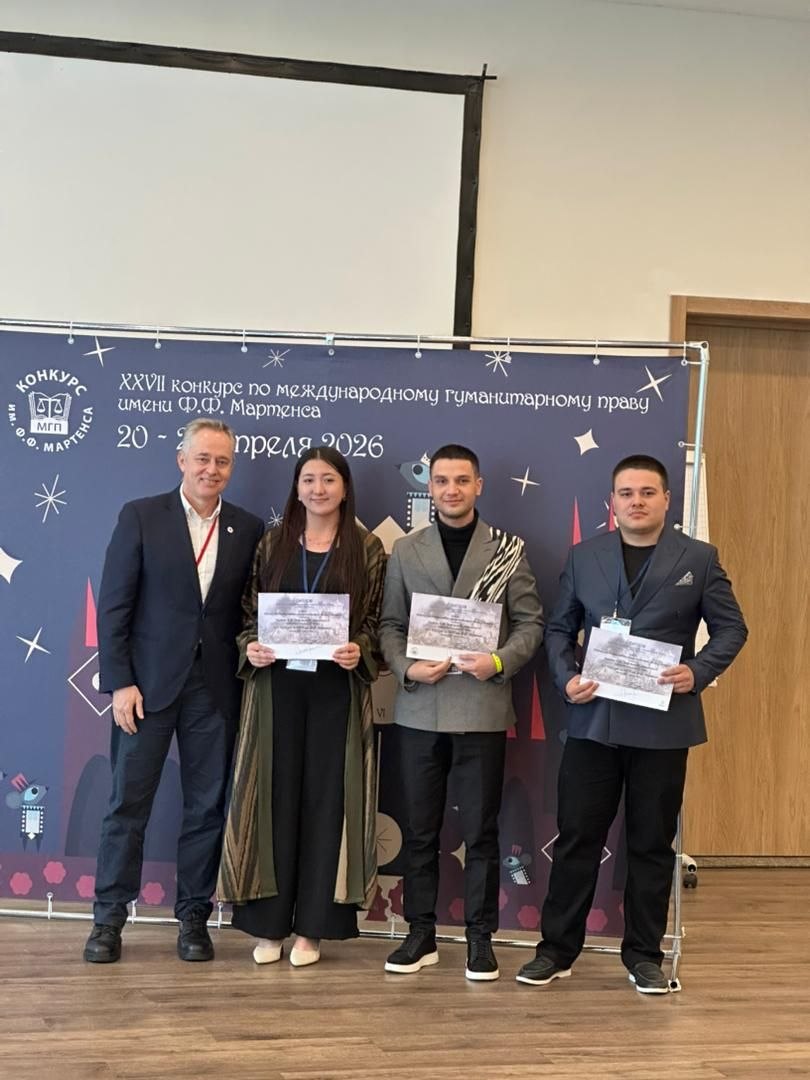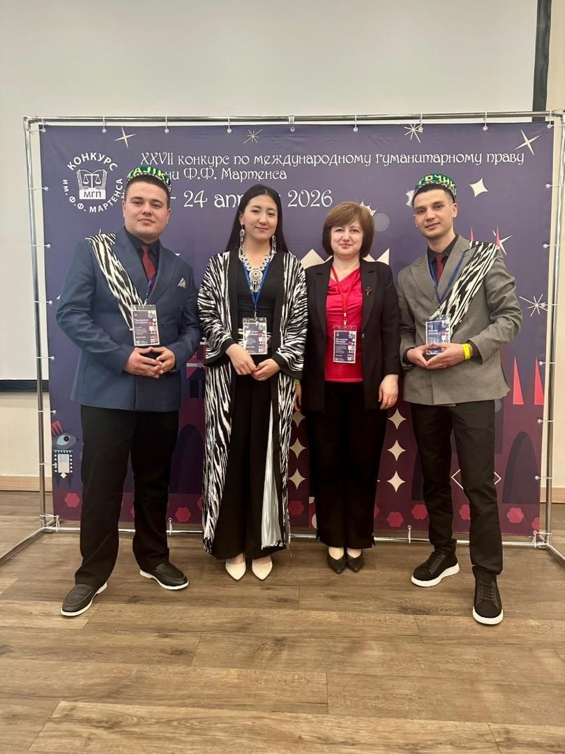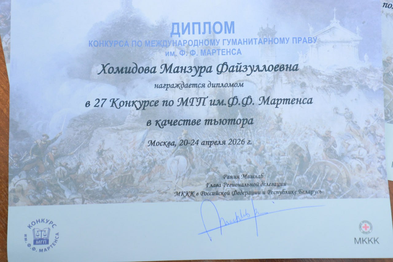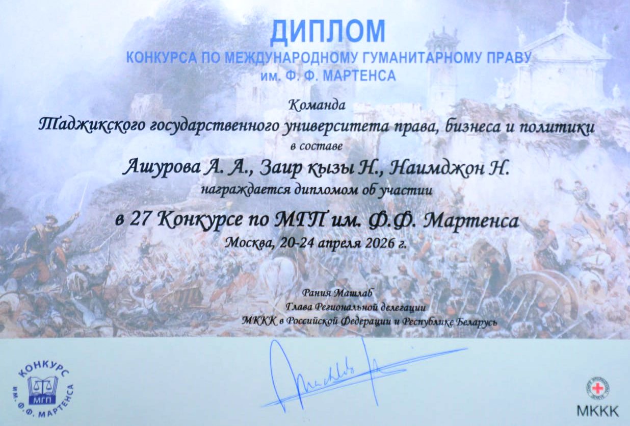Санаҳои 20-24 апрели соли равон 3 нафар донишҷӯёни факултети ҳуқуқшиносии ихтисоси ҳуқуқи байналмилалӣ, гуруҳи таҳсилашон бо забони англисӣ, бо роҳбарии дотсенти кафедраи ҳуқуқи соҳибкорӣ ва байналмилалӣ Манзура Ҳомидова дар озмуни байналмилалӣ оид ба ҳуқуқи байналмилалии башардӯстӣ ба номи Ф.Ф.Мартенс, ки дар шаҳри Москваи Федератсияи Россия баргузор гардид, иштирок намуданд.