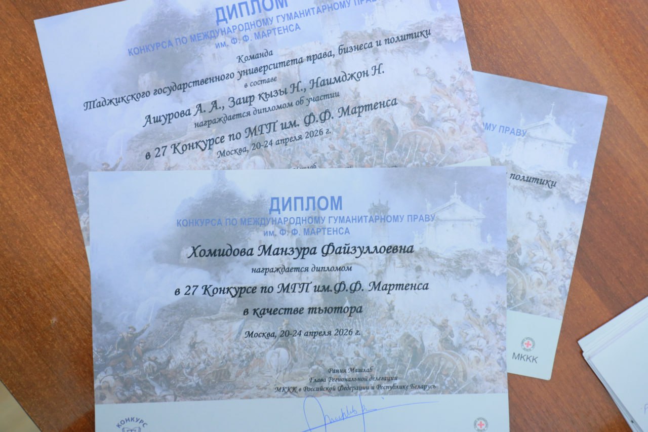 Боиси ифтихор аст, ки донишҷӯёни Донишгоҳи давлатии ҳуқуқ, бизнес ва сиёсати Тоҷикистон соҳаи ҳуқуқшиносии тоҷикро муаррифӣ намуда, барои иштироки фаъолонаашон бо Диплом қадршиносӣ карда шуданд, ки барои рушди касбии донишҷӯёни ҳуқуқшиносӣ саҳми арзанда хоҳад гузошт.