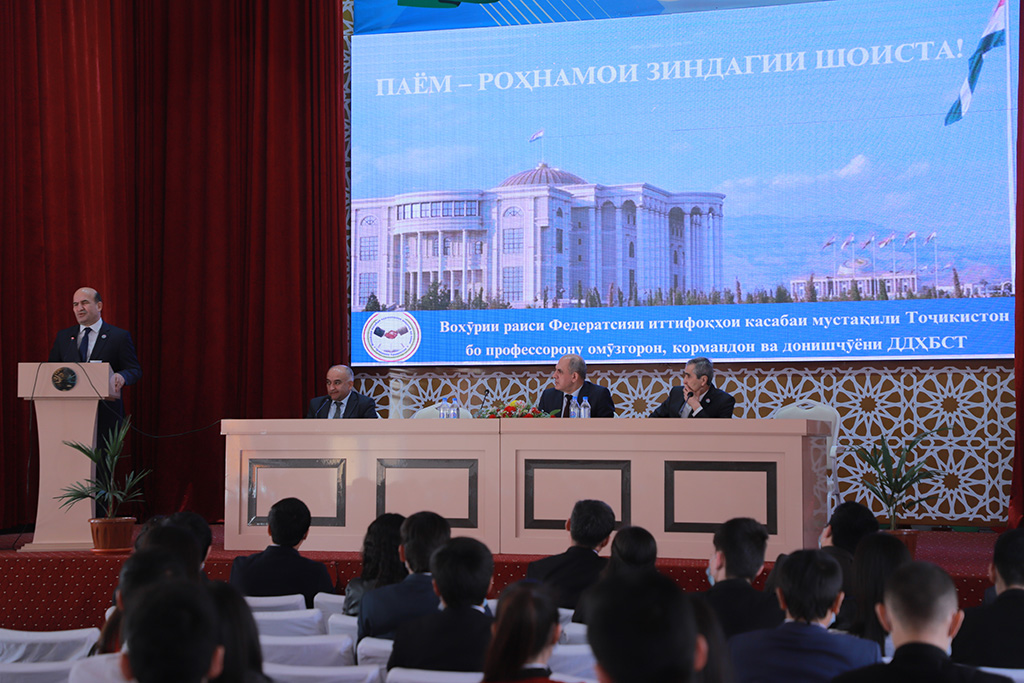 17 феврали соли 2021 дар маҷлисгоҳи Донишгоҳи давлатии ҳуқуқ, бизнес ва сиёсати Тоҷикистон мулоқоти раиси Федератсияи иттифоқҳои касабаи мустақили Тоҷикистон Маликшо Неъматзода бо ҳайъати профессорону кормандон ва устодону донишҷӯёни донишгоҳ доир гардид.